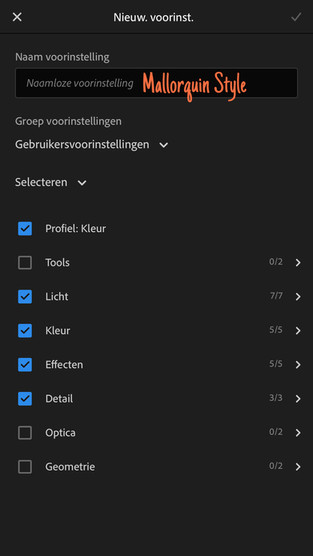 Nu zie je het scherm Nieuwe voorinstelling (hieronder weergegeven) met alle opties die je kunt gebruiken om je voorinstelling aan te passen. Geef de voorinstelling een naam (bijvoorbeeld Mallorquin Style, Lighten of Turquoise), klik op Gebruikersvoorinstellingen, maak aan Nieuwe groep voorinstellingen en noem deze Mallorca presets.
